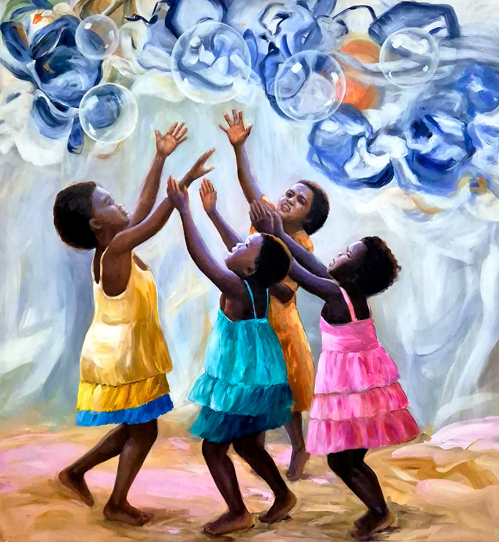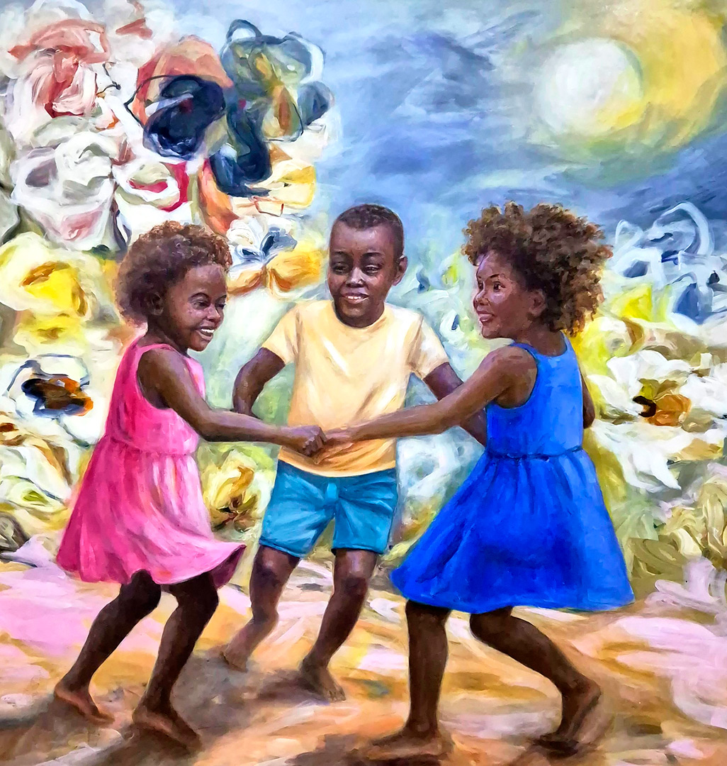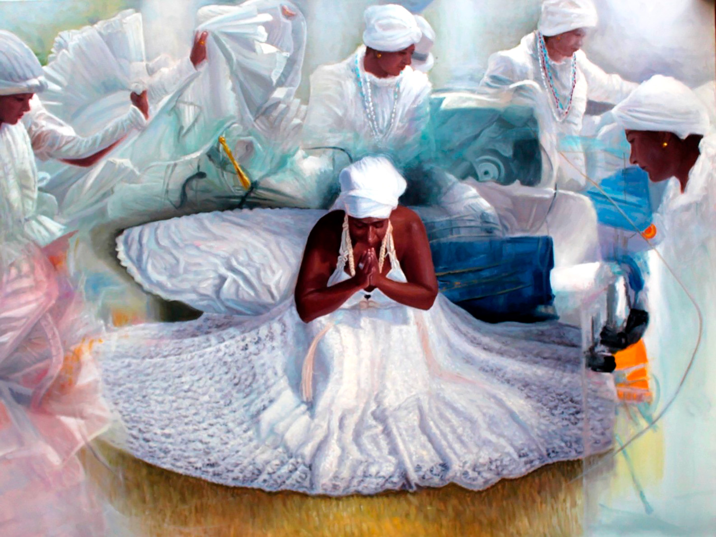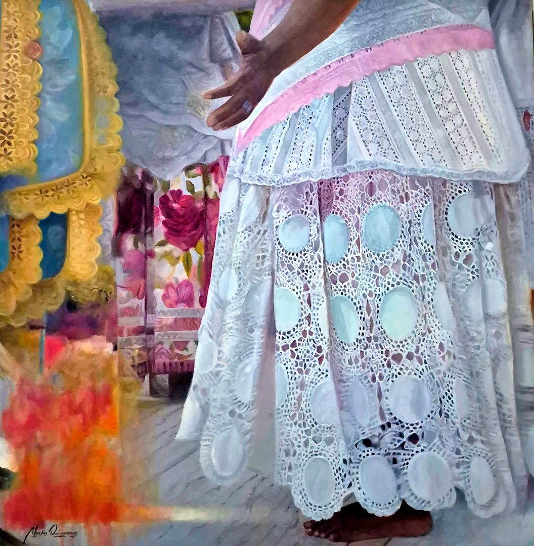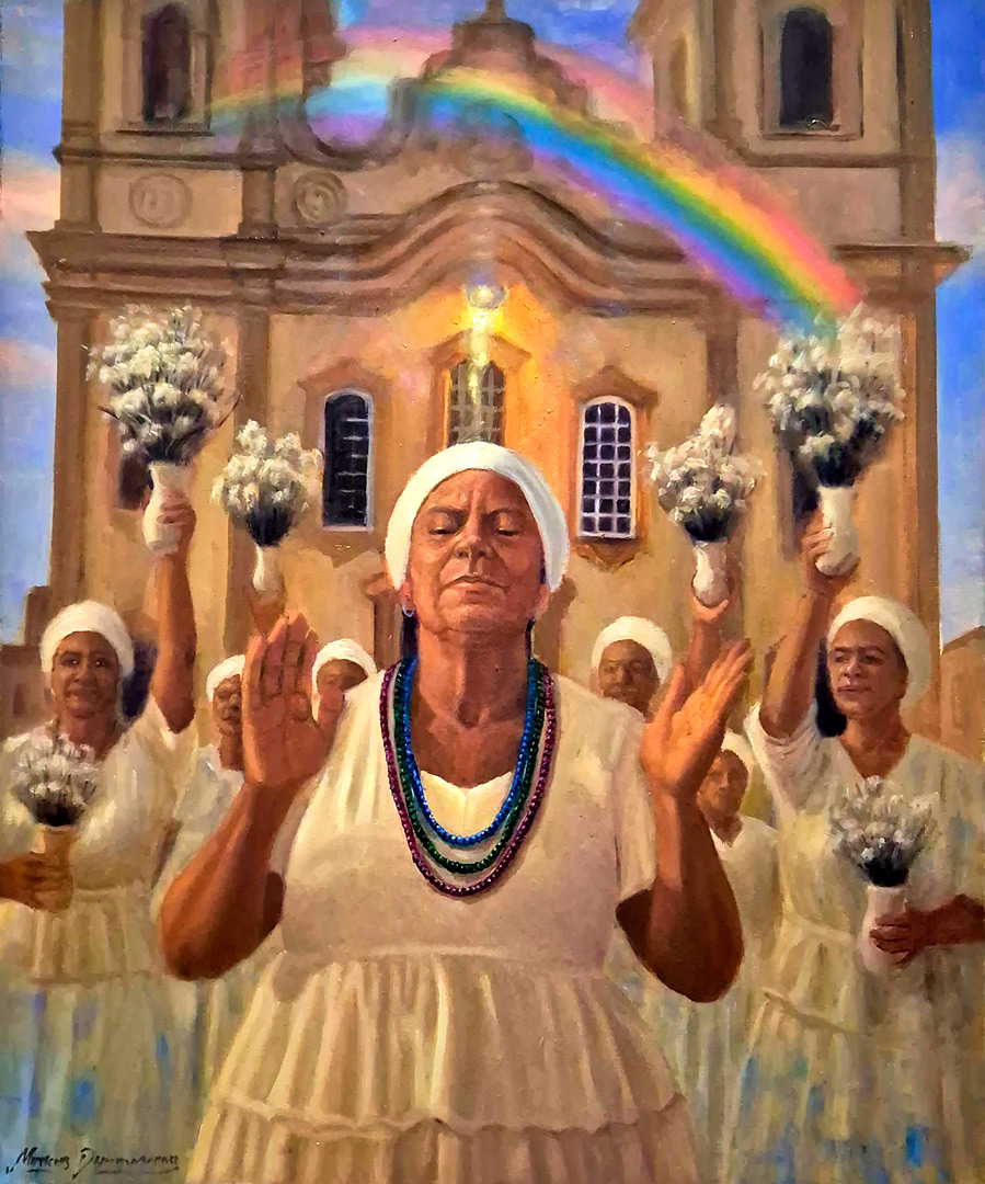 O que se vê em seus quadros: tecidos, danças, colares, búzios e gestos - não são símbolos de uma fé institucionalizada, mas expressões vivas de um povo que soube transformar dor em beleza, exílio em ritmo, silêncio em cor. Ele pinta a ancestralidade, aquilo que vem antes da palavra “religião”. Recria o que pulsa no corpo, no gesto, na terra, pintando a herança de uma história que o Brasil tentou apagar, mas que se fez cor, canto, axé. A ancestralidade em suas obras não é passado. É um presente vibrante.
